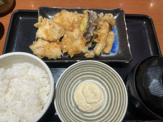 天ぷら同様に揚げた鶏、ナス、かぼちゃに甘酢を和えたもの。タルタルソースが添えられる。