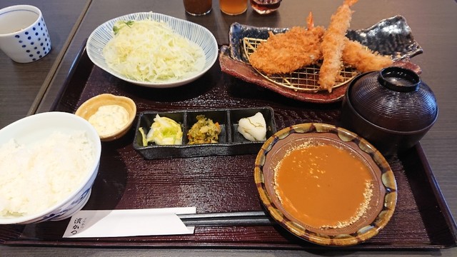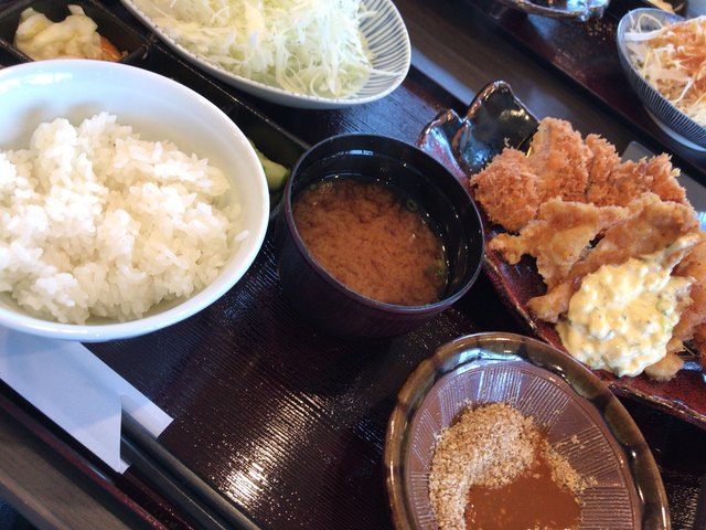 注文したのは、ロースカツとチキン南蛮とエビフライのセット。もちろん、味噌汁、ご飯、漬け物付き。