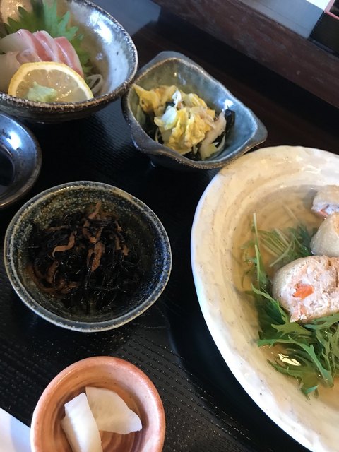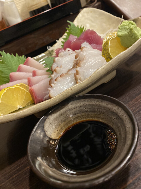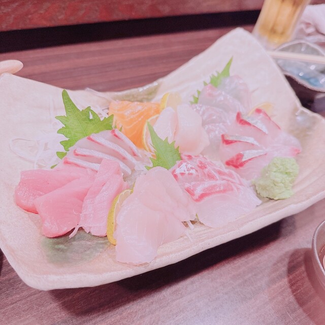 お刺身を食べたいのですが、黒板メニューは単品が並んでいます。お店の方に盛り合わせをお願いしたところ、美しく盛られた一皿がきました。お刺身はどれも新鮮で美味しく満足です。
