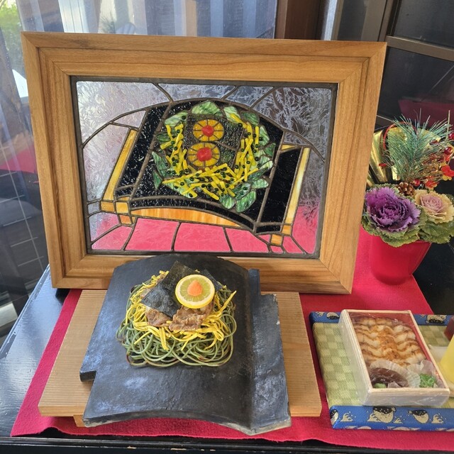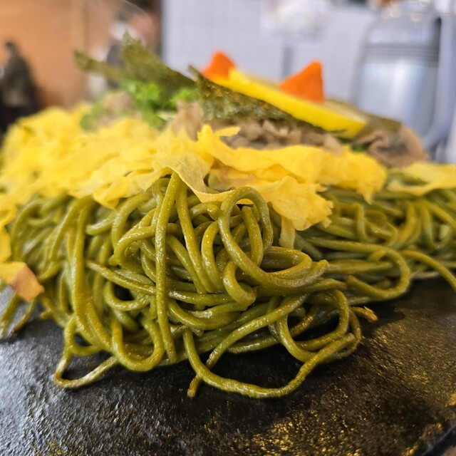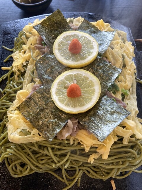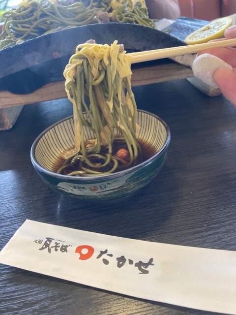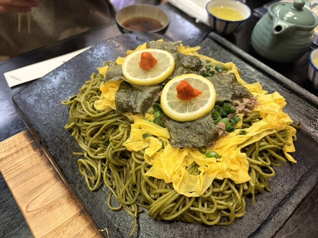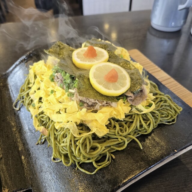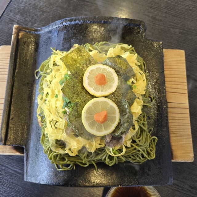 「茶そば」は国産そば粉と京都(宇治)上級抹茶を石臼挽きにしたものを使用。300度に熱した瓦に「茶そば」・「錦糸卵」・「牛肉」・「ねぎ」・「レモン」・「赤おろし」を飾り特製のそばつゆで召し上がります。
