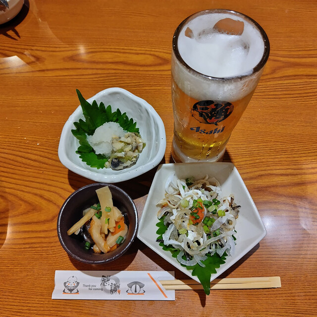 まず生ビールを注文するとお通しが一緒に出てきます。