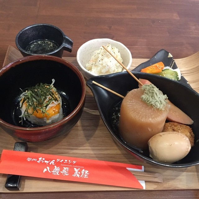 全てのお客様に満足して頂くを目標に、日々試行錯誤を重ねる創作おでんと熟成肉が楽しめる【関門おでんダイニング八艘飛 義経】店内は入ってすぐに樽テーブルとハイチェアーのおしゃれなバルスペースになっております。カウンターや座敷・個室も御座いますので、デートや宴会でのご利用はもちろんお一人様でもお気軽に♪また、義経自慢の創作おでんは食材本来の旨みを活かす調理法で、シンプルながらもとても味わい深く優しい口当...たりが特徴!!同じく大人気の熟成肉は九州産の黒毛和牛を使用。真空低温調理で仕上げている為、凝縮されたお肉本来の旨みを味わえます!!お酒はビールからカクテル・ワイン・日本酒と幅広く取り揃え国内外で高評価の山口銘酒【獺祭】も常備しリーズナブルにご提供!!おでんと肉とワインのお店【関門おでんダイニング八艘飛 義経】に是非、お越し下さい♪スタッフ一同心よりご来店お待ちしております!!