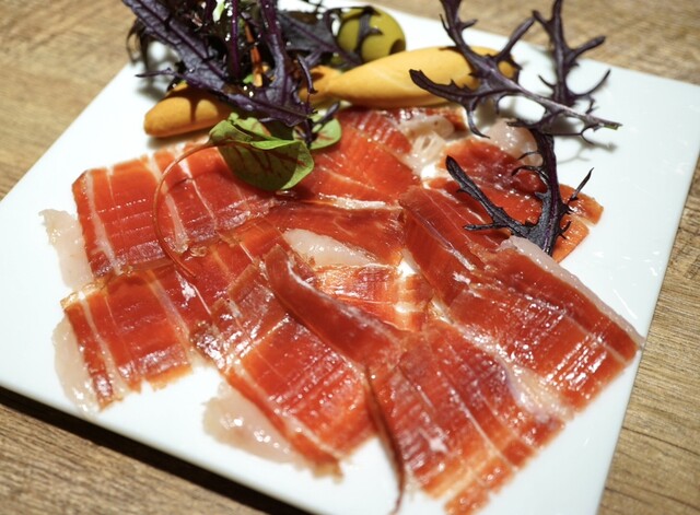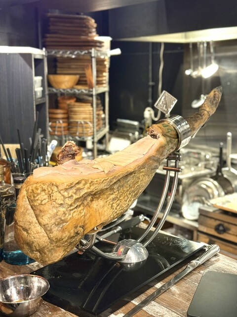 →体温でとろける脂身、旨みの凝縮された絶妙な塩気の生ハム。原木からの切り落としで、これはめちゃ美味しい。ちゃんとしたお値段しますが、納得です...