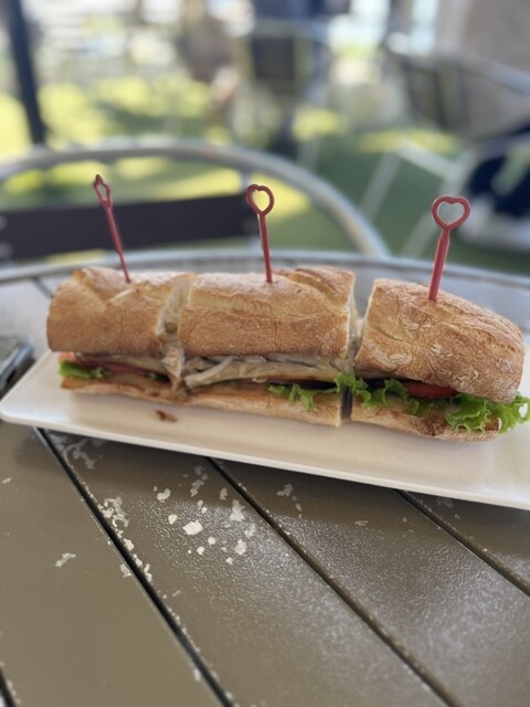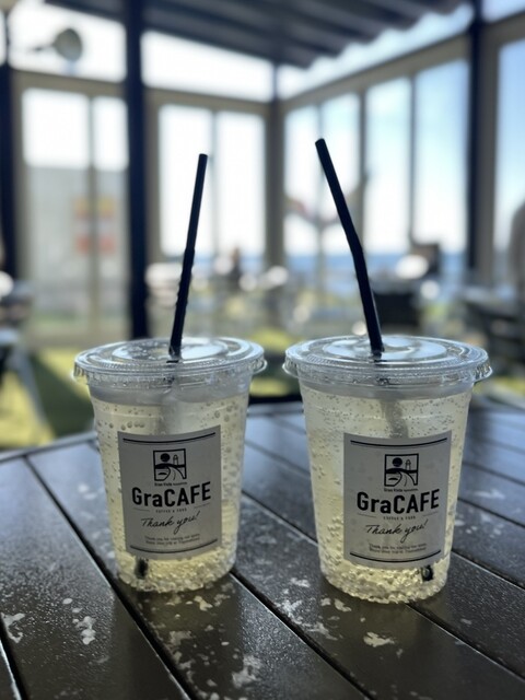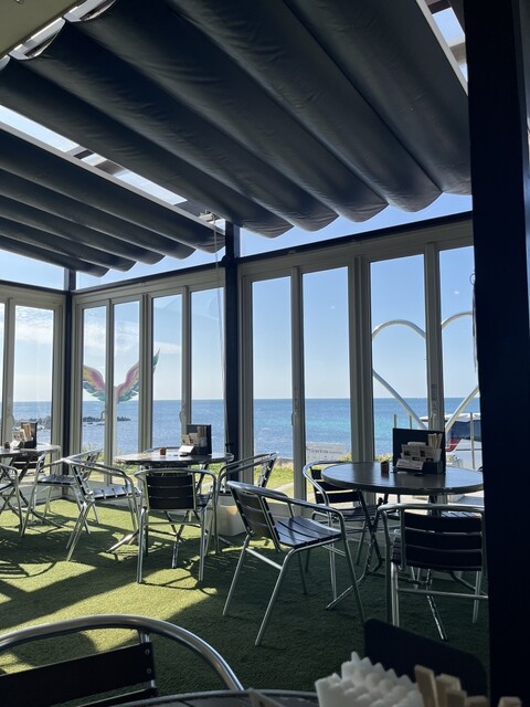 伺ったのは島の最奥にある「グランビスタ角島」さん。宿泊もできる施設も兼ねています。この日は午後から雨の予報で曇りでしたが海が一望できるテラス席に座ります。