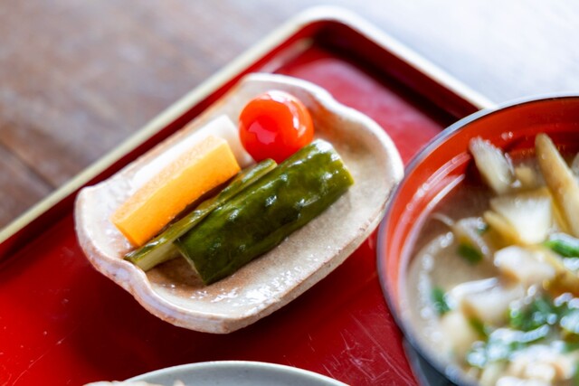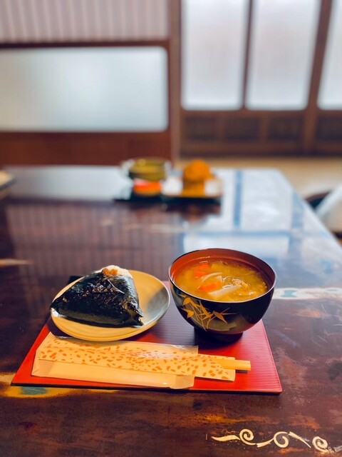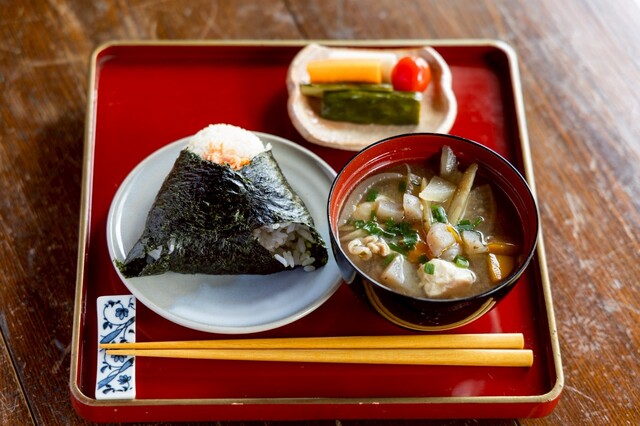 ぶづきおむすび(ぶづき玄米)を豚汁と自家製漬物またはピクルスのセットで提供しています。お米は我が家で大事に育てているお米を使っています。
