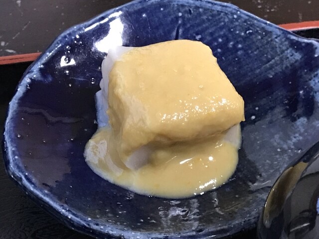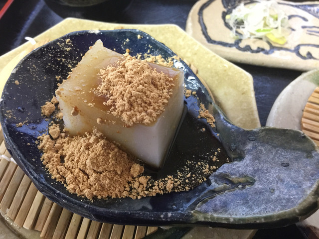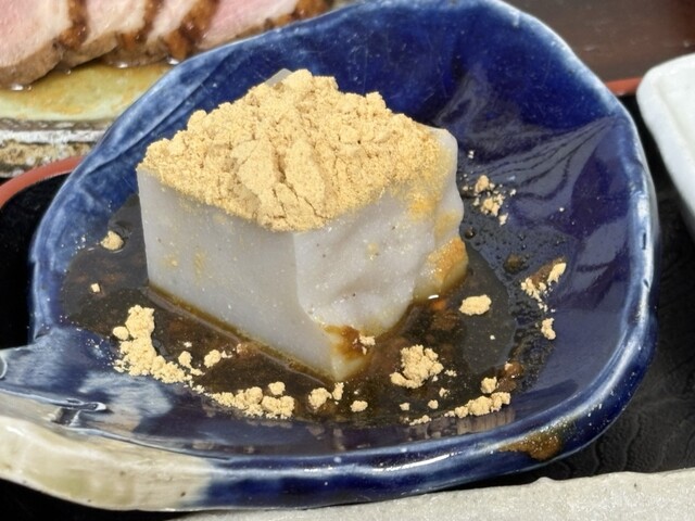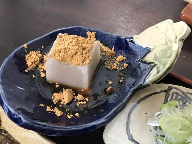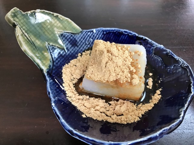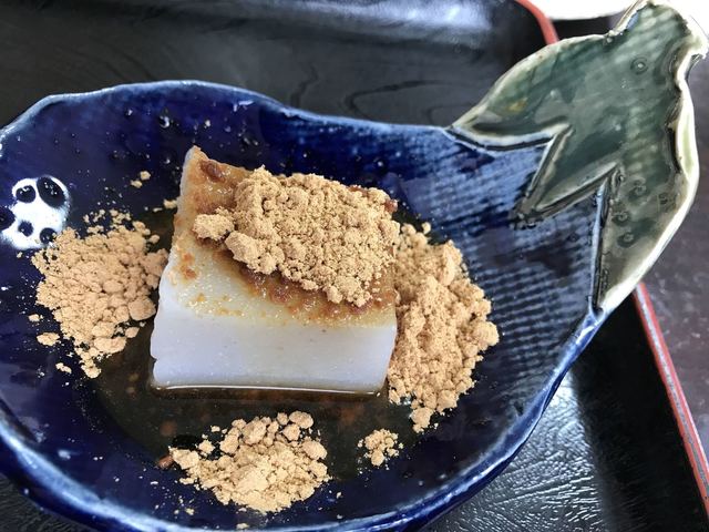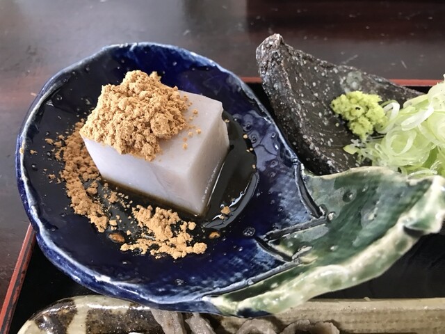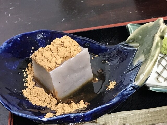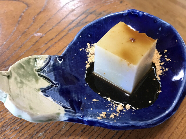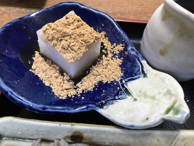 そば豆腐(黒蜜きなこ) そば豆腐はモチモチプルプル食感。黒蜜とタップリのキナコがかかっていて