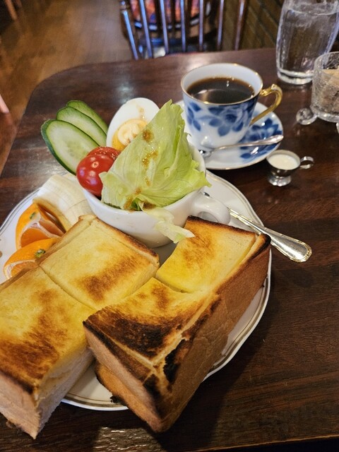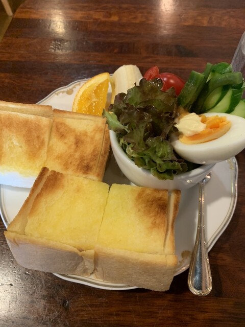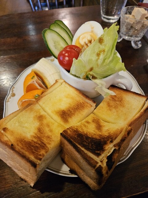 トーストセットは厚みのあるバターたっぷりのトーストとサラダ、フルーツ、コーヒーのセットでお得。