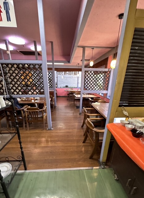 初めてでしたが、店内広い!そして造りがユニーク。ガラス張りでおしゃれ風なのに漫画が置いてあったり、昔の洋食屋さんの構えですね。