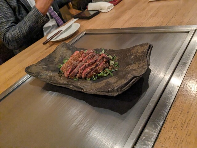 高級感ある鉄板焼レストランで懇親。 サラダ、黒毛和牛のたたき、厚切りベーコン、お好み焼き風長芋ステーキ、黒毛和牛レアハンバーグ、甲州和牛サーロインステーキのコース。 レ... 詳細を見る