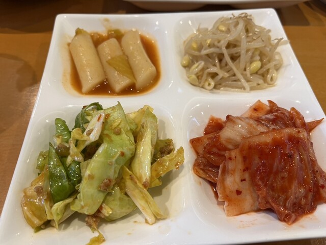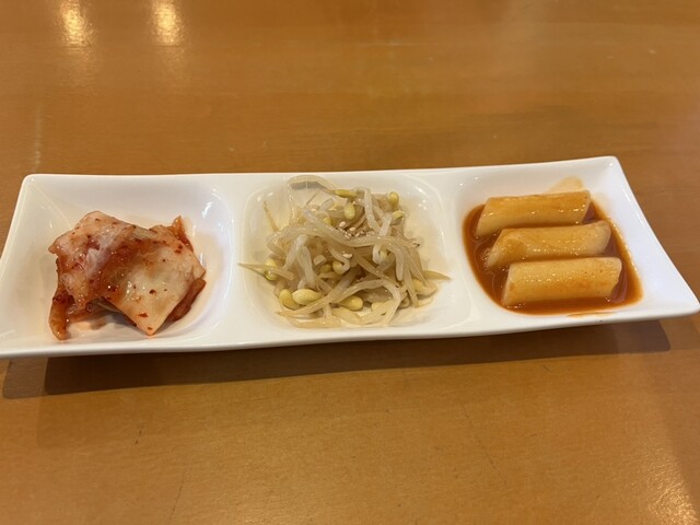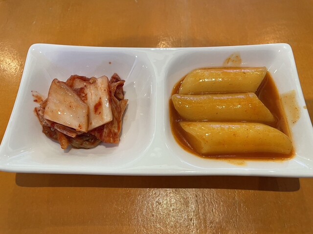 まずは付け合わせの韓国のりとキムチとナムルとトッポギが運ばれてきました。ちなみにビビンバの方はキムチとナムルが付き合わせ。
