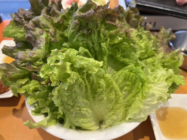 レタスにキムチやナムル、韓国のりとお肉を乗せて、レタスで巻いて、ごま油塩か味噌をつけて食べました。以外にもサッパリと食べられます。斜めに置かれた鉄板からは大量の油が流れていたので、余分な油が抜けて、その上にレタスや他の材料でよりしつこくなく食べられました。あまりお肉が得意ではない私ですが、あっという間に食べてしまいました。