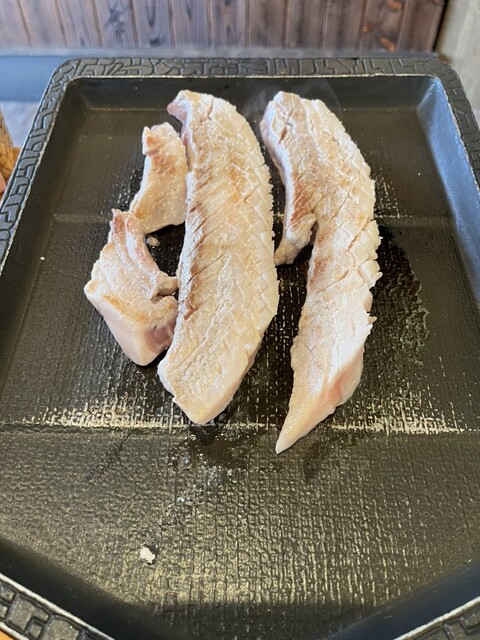 テーブルに韓国のりやキムチ、ナムル、トッポギやサラダが運ばれてきた後、大きな豚バラ肉が運ばれて来て目の前で焼いてくれました。またこのご時世にしては大量のサニーレタスも。