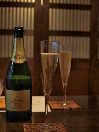 辛口スパークリング。すっきりした後味なので、前菜から濃厚なすき焼きまで