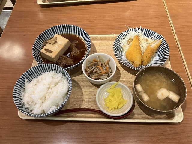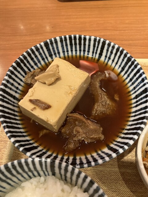 がっつけ肉丼はどんぶりめしの上に牛スジとこんにゃく、固めの豆腐、それに紅ショウガ乗っています。