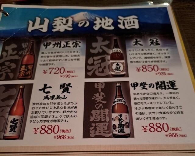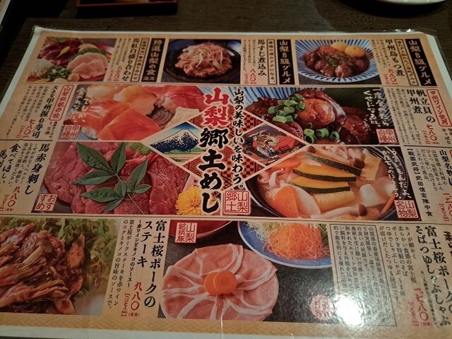 アテはやっぱり「山梨郷土料理」の中からなにか…。全体的にお値段ちょっと高め。しかたないね、観光客向けや。