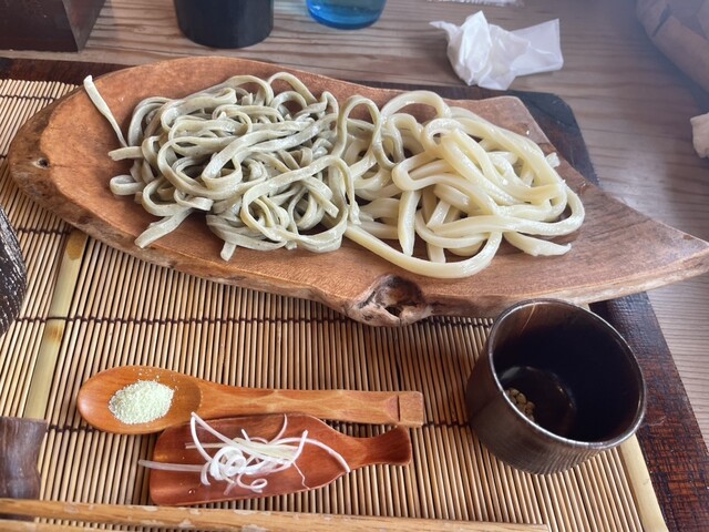 一般的に想像する蕎麦とはまったく違い、こちらは太くて硬さのしっかりとした、平打ち麺。啜るというより、噛んで味わうタイプで、いわゆる「つるつる」と喉ごしを楽しむ蕎麦とは対極にあるスタイルです。口いっぱいに広がる...