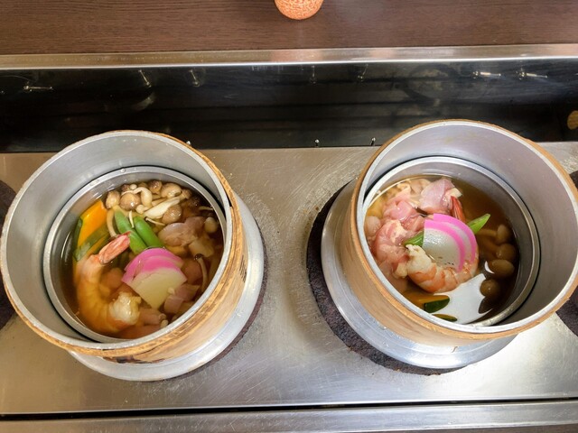 卓上の備え付けコンロで、目の前で釜めしを炊いてくれるので、ちょっとしたエンターテインメント感もあり!蓋をしないで炊くので、ぐつぐつした様子を見るのもとても楽しい。蓋をしないのに炊けるって不思議。