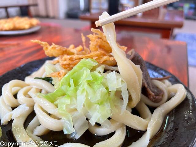 大広間で頭を寄せ合っていただく固い麺と、麺に良く合う香ばしい野菜天を十分に味わってください。