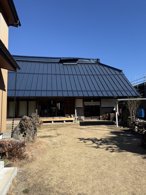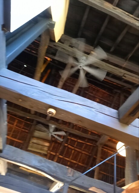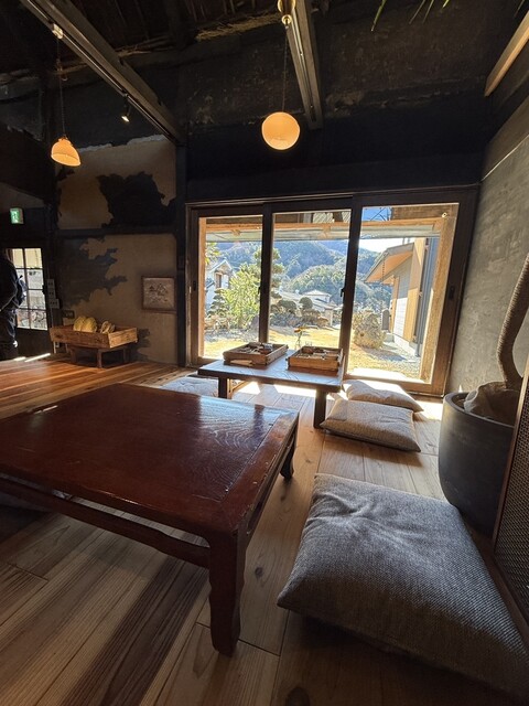 古民家系、靴脱ぐ系、天井は梁が丸見えですごいです。